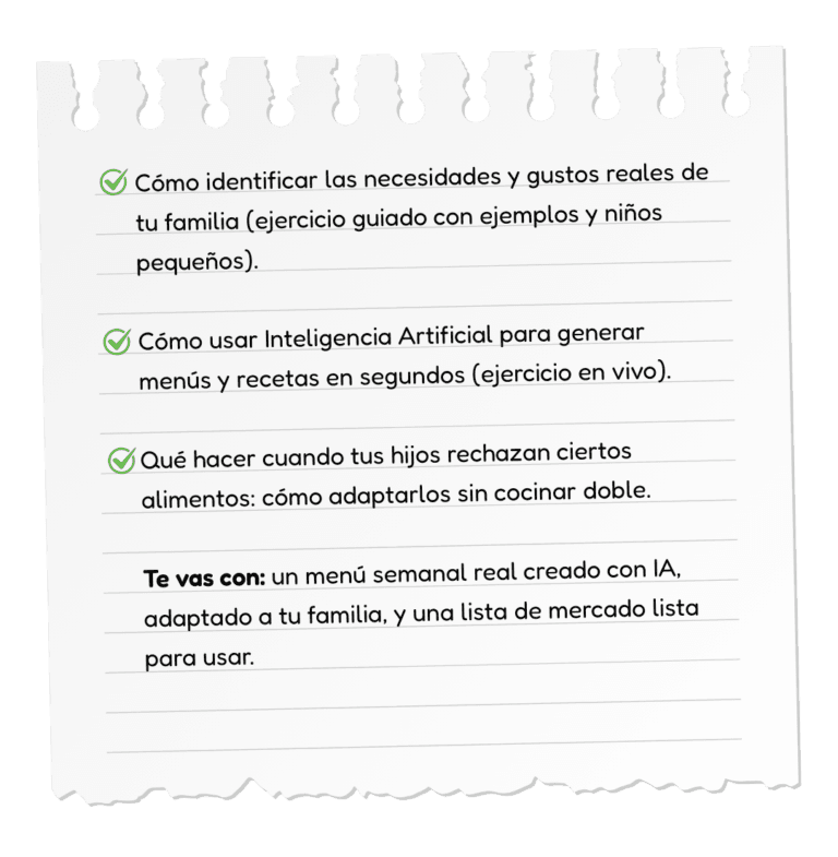 ✅ Clase en vivo donde aprenderás paso a paso a planificar comidas con IA sin complicarte.