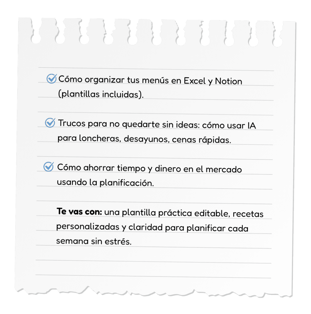 ✅ Plantillas listas para usar en Excel y Notion para tu menú semanal, lista de mercado y loncheras.